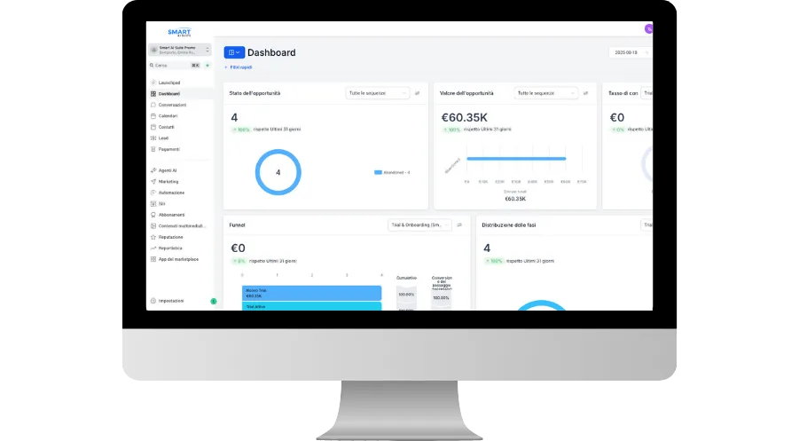 Numeri chiari, decisioni più rapide. La dashboard di Smart AI Suite raccoglie in un unico posto KPI di marketing, vendite e operatività: campagne, conversazioni, prenotazioni, ricavi e tassi di conversione. Nei piani avanzati attivi anche suggerimenti intelligenti e previsioni basate sui dati, per capire dove intervenire e quando scalare.